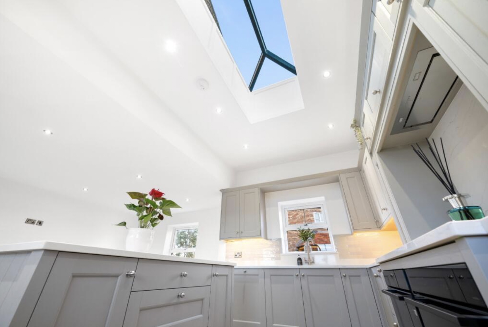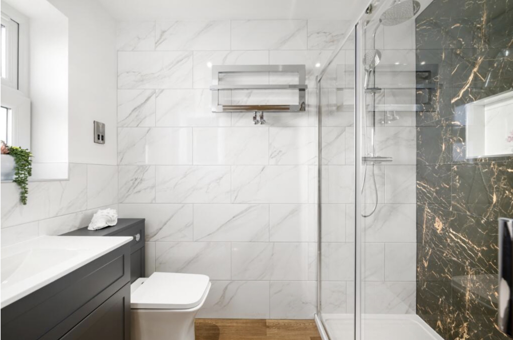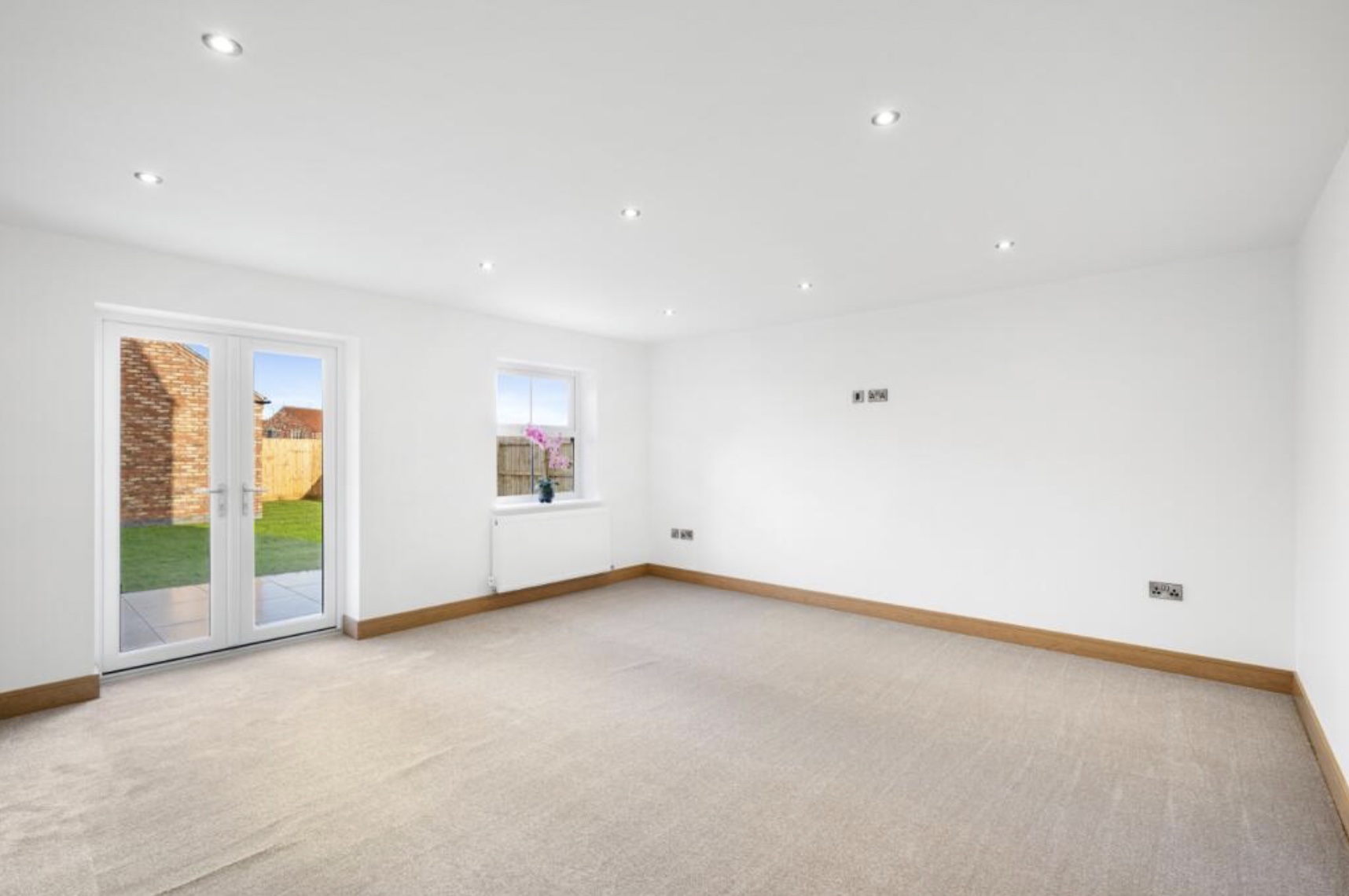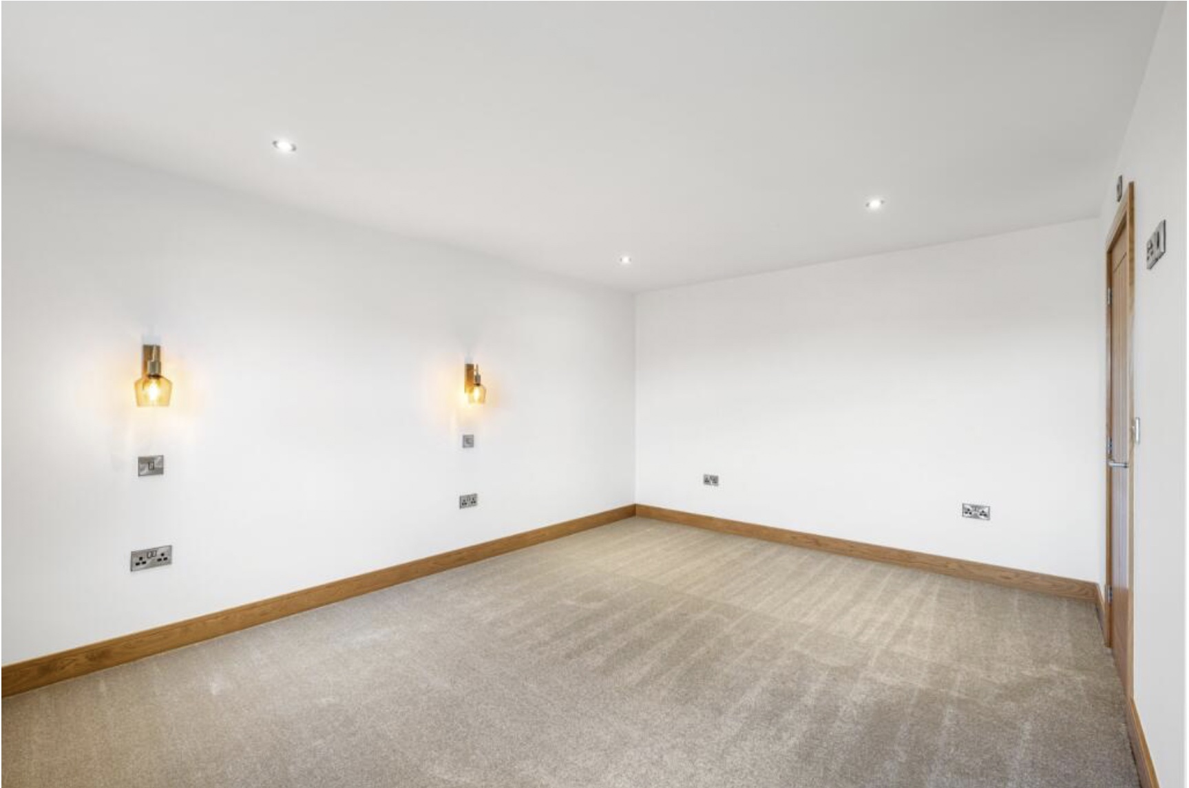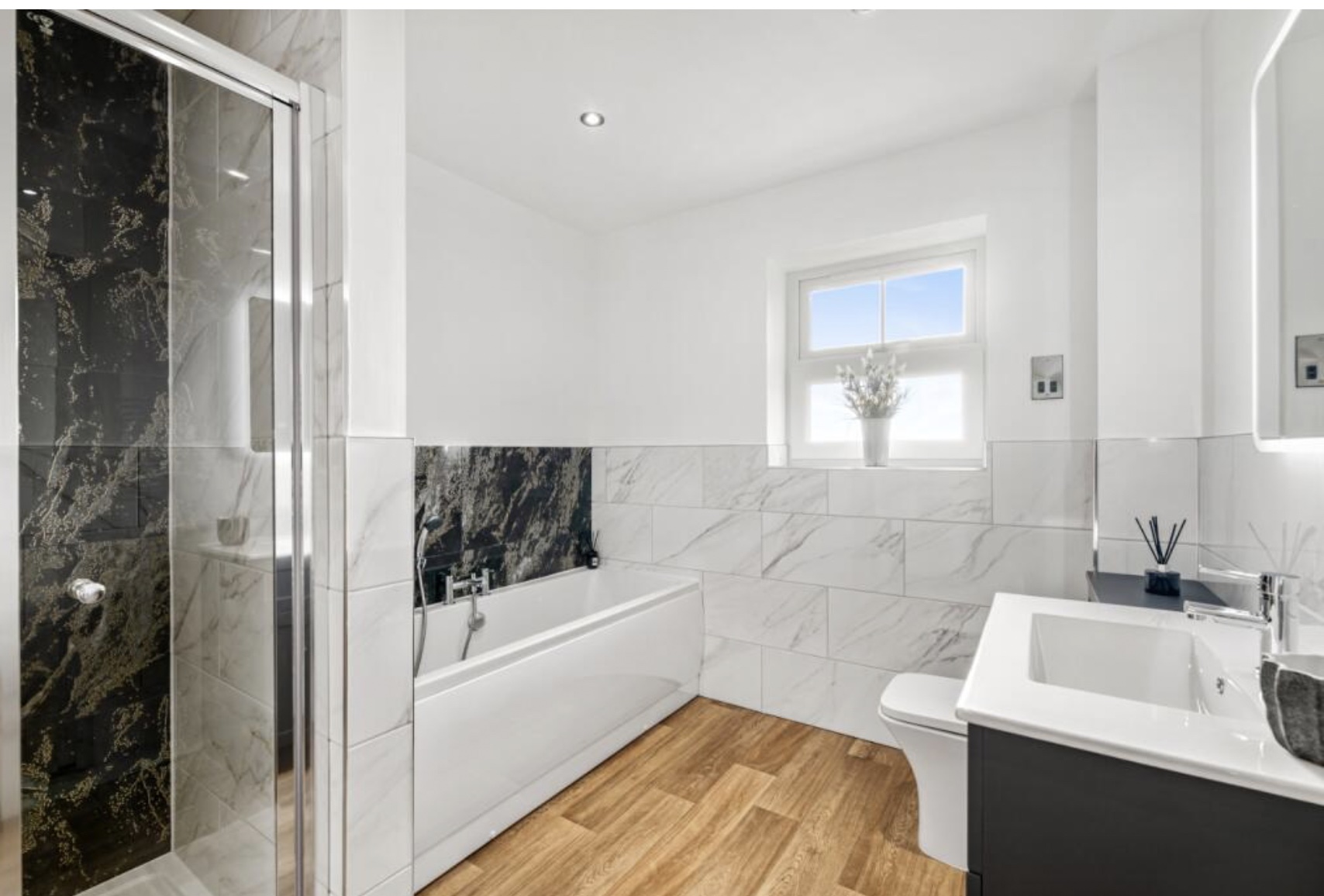 Upstairs there are 4 double bedrooms, with an ensuite in the master bedroom. Both bathrooms contain fitted cabinetry, with plenty of storage, and LED mirrors. The master bedroom also comes fitted with bedside wall lights, creating a cosy and inviting space to unwind in.